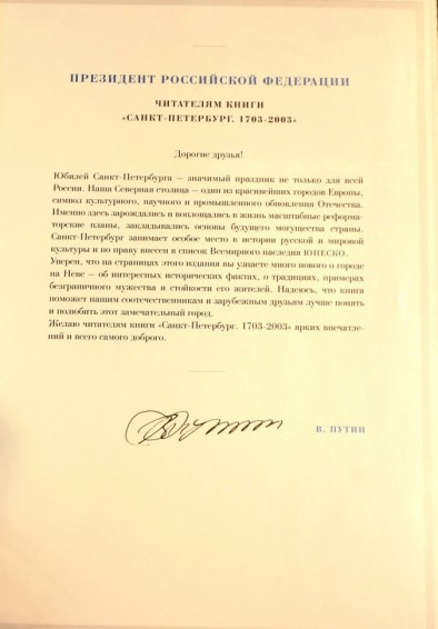 Альбом был подготовлен специально к празднованию юбилея Северной столицы как официальный подарок Владимира Путина главам государств — гостям Санкт-Петербургского саммита и стал главным изданием о 300-летнем юбилее Петербурга. Книга содержит свыше тысячи великолепных иллюстраций, архивные и современные фотографии, а также репродукции картин, гравюр, литографий и рисунков многие из которых являются уникальными свидетельствами истории и культуры великого города на Неве. Выдающийся авторский коллектив историков и искусствоведов под руководством государственного герольдмейстера России Г. В. Вилинбахова сделал все возможное, чтобы с максимальной полнотой рассказать историю северной столицы и передать обаяние Санкт-Петербурга. Целью авторов и составителей было показать особое место города на Неве в истории русской и мировой культуры.