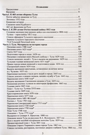 Первые две главы посвящены событиям 460-летней и 200-летней давности: Обороне Тулы в 1552 году и участию Тулы и туляков в Отечественной войне 1812 года. Вы найдете краткие описания жизни 24 генералов туляков участников той войны. Многие документы опубликованы впервые. В третьей главе собраны сохранившиеся в Московском архиве РГАДА документы с пофамильными переписями туляков в XVI–XVIII вв., а также имена тех, кто охранял Тулу и подступы к ней от врагов. Найди свою фамилию или своих друзей в Именном указателе и посмотри кем они были и чем занимались в те далекие времена. Узнай историю своего рода. Очень интересны описания города Тулы — сметы, которые составлялись, когда один воевода передавал город другому, своего рода приемо-сдаточный акт. В них очень подробно описаны строения и укрепления Тулы, их вооружение, запасы боеприпасов. В хорошем состоянии.