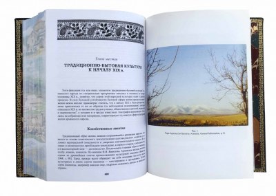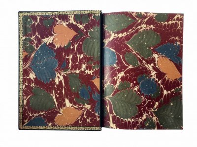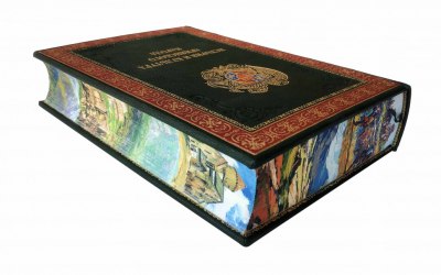 Книга в цельнокожаном переплете ручной работы с тиснением золотом. Стилизованные обрез и форзацы.