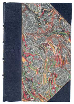 В составном переплете ручной работы. Крышки оклеены «мраморной» бумагой. Корешок и углы из черной кожи