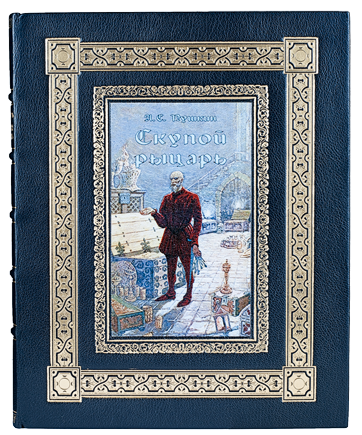 «Скупой рыцарь» — произведение из цикла коротких пьес Александра Сергеевича Пушкина (1799–1837) «Маленькие трагедии», объединенных общей идеей разоблачения человеческих пороков и страстей. Написано в 1830 году в Болдине. Опубликовано в 1836 году. Опасаясь упреков в незавершенности произведения, автор прибегнул к изданию его в форме литературной мистификации: подзаголовок «Сцена из Ченстоновой трагикомедии. The Covetous Knight» отсылал к творчеству Вильяма Шенстона, у которого в действительности нет сочинений с таким названием. Редкое издание 1908 года издательской фирмы А.С. Суворина (1834–1912). Роскошно иллюстрированная книга с рисунками С.Ф. Плошинского.В синем цельнокожаном переплете ручной работы с тиснением золотом и иллюстрацией на передней крышке. «Мраморный» обрез. Синее тонкое шелковое ляссе.
