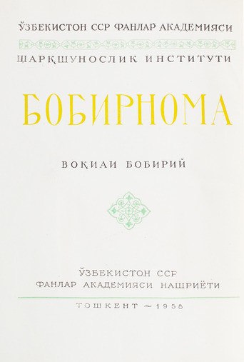 Бабур З.М. Бабур-наме: Записки Бабура / [пер. М. Салье]; [отв. ред. и авт. предисл. канд. ист. наук С.А. Азимджанова] ; [ил.: В.Е. Кайдалов]; Акад. наук Узбек. ССР. Ин-т востоковедения. [Декада узбекского искусства и литературы. Москва. 1958]. Ташкент: Изд-во Акад. наук УзССР, 1958. 529 с., 13 л. ил., карт.
