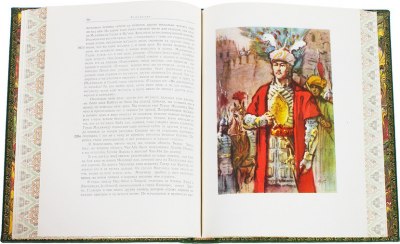 В зеленом цельнокожаном переплете с иллюстрацией на передней крышке. Форзацы из «мраморной» бумаги.