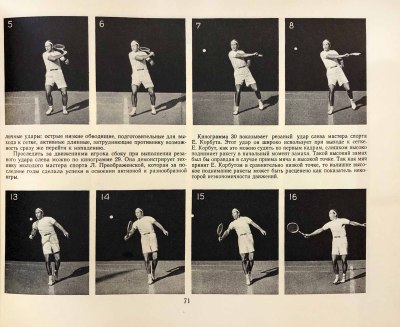 Большое внимание уделено психологической составляющей участия в соревнованиях и тенниса вообще. Издание иллюстрировано кинограммами, которые шаг за шагом демонстрируют позы, стойки, схемы движения, удары, исполненные профессиональными спортсменами на максимально высоком техническом уровне. В издании показываются отличительные черты советской школы спортивных игр. Речь идет о таких ключевых элементах игры, как активная игра у сетки, игра у задней линии площадки. Предлагаются оригинальные тактические замыслы.