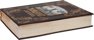 В цельнокожаном переплете ручной работы с тиснением золотом и иллюстрацией на передней крышке