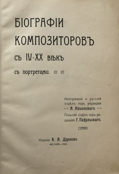2) Русский отдел. Русский отдел начинается биографией итальянского композитора Арайи, в царствование императрицы Анны Иоанновны приглашенного в качестве придворного композитора в Петербург, на протяжении 28 лет написавшего там 17 опер и по справедливости считающегося основателем русской оперы.