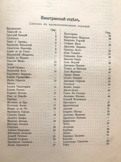 1) Иностранный отдел. Начинается с биографий св. Амвросия и папы Григория I Великого как первых составителей свода церковных песнопений, и заканчивающегося биографией Рихарда Штрауса, выдающегося представителя музыкального творчества Германии.