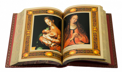 Подарочное иллюстрированное издание, посвященное образу Пресвятой Богородицы в изобразительном искусстве. Книга-альбом содержит повествование о земной жизни Богородицы, текст сопровождается многочисленными репродукциями икон и картин русских и западно-европейских художников XII –XX веков. Каждую страницу украшают орнаменты русских и византийских рукописей X–XVI веков. Картины великих мастеров — Микеланджело, Ван Дейка, Кранаха, Липпи, Джотто, Рафаэля, Рембрандта, Рубенса, Боттичелли, В. Васнецова, Н. Бруни, В. Боровицкого и многих других, воспевают в красках Богородицу и Спасителя — Иисуса Христа. Представлены события из Священного Писания, сцены из Священной истории — сказания о земной жизни Богороди-цы, дни празднеств в честь ее чудотворных икон, молитвы Пресвятой Богородице. Эта книга — путеводитель по изобразительному искусству и по миру духовному, в ней каждый читатель найдет свою Богородицу через неповторимые визуальные образы, созданные на протяжении многих веков.В красном цельнокожаном переплете ручной работы с тиснением золотом и изображением Богородицы на передней крышке. «Мраморный» обрез. Красное тонкое шелковое ляссе.