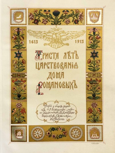 Роскошное юбилейное издание, вышедшее к трехсотлетию правящего дома Романовых. Одно из самых дорогих и красивых русских изданий начала прошлого века. Деньги от продажи издания пошли на благотворительные цели. Встречается реже других книг, изданных к 300-летию дома Романовых.