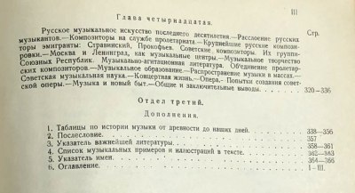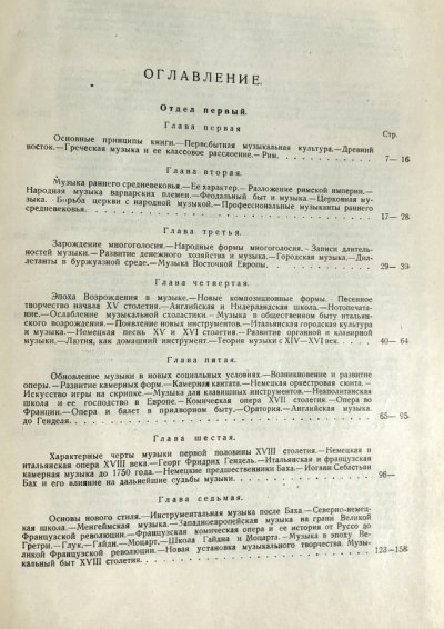 Назначение очерка, представленного в книге, — обслужить интересы главным образом тех лиц, которые, стремясь серьезно ознакомиться с историей музыкального искусства, впервые приступают к изучению таковой. Поэтому мы сочли необходимым иллюстрировать свое изложение рядом нотных примеров, снимков предметов материальной культуры в музыке (музыкальные инструменты, нотные записи и т.д.), а также специальными синхронистическими таблицами в конце книги. Все эти приложения имеют крайне сжатый характер и служат лишь для поддержки основных положений книги. Музыка — одно из наиболее сложных искусств. Являясь отражением классовой борьбы в различных социально-экономических формациях, она идет своеобразными путями, отличными от других искусств. Наиболее близкие аналогии возможны при сравнении истории музыки с историей театра и литературы. С ними музыка теснее всего связана, и эти сближения просто необходимы дли выяснения ее исторического значения.