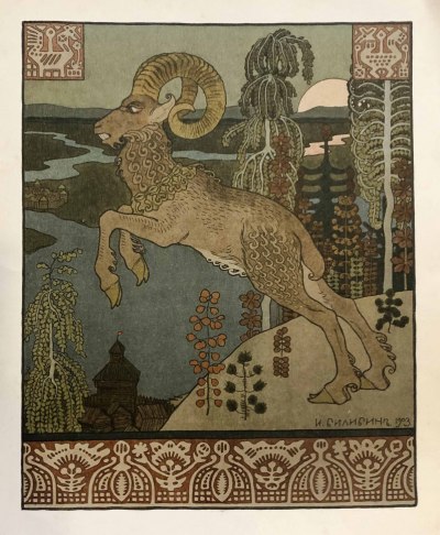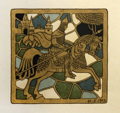 Иван Яковлевич Билибин — русский художник, книжный иллюстратор и театральный оформитель, участник объединения «Мир искусства». Он разработал особый «билибинский стиль» книжного дизайна, продолжающий традиции древнерусского орнамента. Вольга Святославич — богатырь, персонаж русских былин. Основными отличительными чертами этого героя являются способность к оборотничеству и умение понимать язык птиц, рыб и зверей.