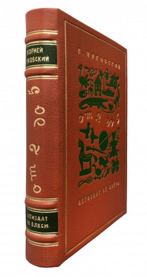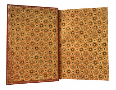 В цельнокожаном переплете ручной работы с золотым и цветным тиснением. Узорный обрез. Цветные форзацы.