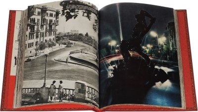 В цельнокожаном переплете ручной работы с тиснением золотом и иллюстрацией на передней крышке. Тонкое шелковое ляссе
