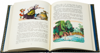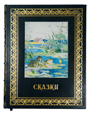 В синем цельнокожаном переплете ручной работы с тиснением золотом и иллюстрацией на передней крышке. Синий тонированный обрез. Синее тонкое шелковое ляссе