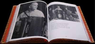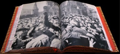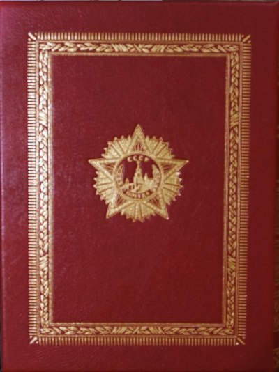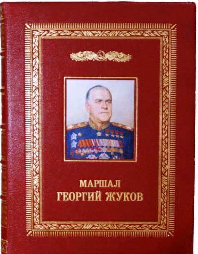 В красном цельнокожаном переплете ручной работы с портретом маршала Г.К. Жукова на передней крышке.