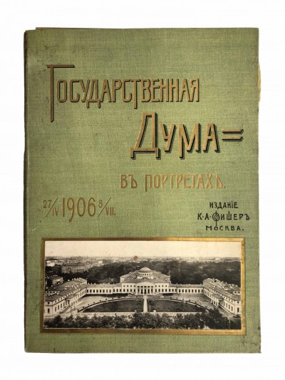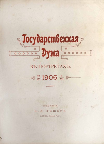 Роскошный альбом портретов депутатов Государственной Думы Российской империи I созыва содержит около 500 фотографий членов Государственной Думы, в том числе фотографии членов президиума, видов самого здания и интерьеров Государственной Думы тех лет, сделанных известным фотографом Карлом Андреевичем Фишером в 1906 году.