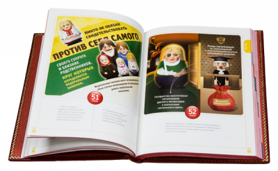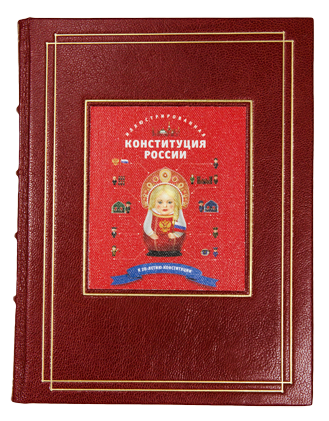 В основу издания своеобразной «Конституции в картинках» вошел текст Конституции России на русском языке, а также его официальный перевод на английский язык. Русскоязычная часть книги проиллюстрирована цветными изображениями и схемами, выполненными преимущественно в инфографике, элементы которой стилизованы под русский национальный стиль, англоязычная часть издания имеет текстовый вид. Художественное оформление структорно-логических схем и инфографика в конституционно-правовой области — явления настолько редкие, что можно говорить об уникальности нас-тоящего издания.Настоящая работа художников Н.В. Худяковой и М.Ю. Го-релова — обладатель многих книжных наград и премий, включая «антипремии». Книга вскоре после поступления в продажу возглавила рейтинг магазина «Москва». «Иллюстрированная Конституция России» вызвала разнообразные отзывы политиков, как позитивные, так и негативные. Комикс-Конституция содержит немало уникальных картинок. Так, на странице, описывающей права граждан на медпомощь, выясняется, что у матрешек есть скелет. Примеры с матрешками вызвали бурную дискуссию в Ру-нете не только о скрытом подтексте картинок, но и о том, нуждается ли в принципе Конституция в популяризации...», — писала газета «Московский комсомолец» после издания книги.В красном цельнокожаном переплете ручной работы с тиснением золотом. Тонированный обрез. Красное тонкое шелковое ляссе