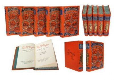 Каждый том в цельнокожаном переплете ручной работы с тиснением золотом.