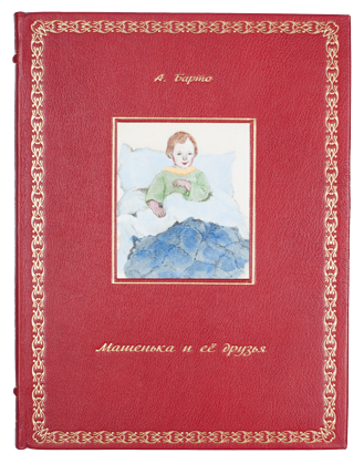 В красном цельнокожаном переплете ручной работы с тиснением золотом и иллюстрацией на передней крышке. Обрез с красным краплением. Красное тонкое шелковое ляссе