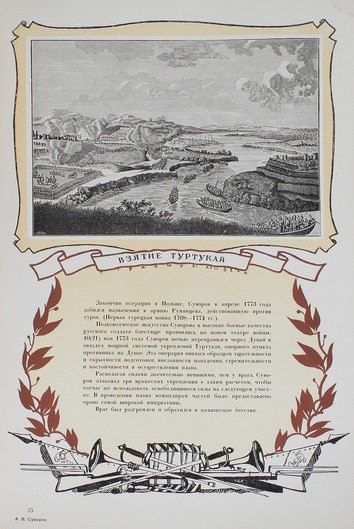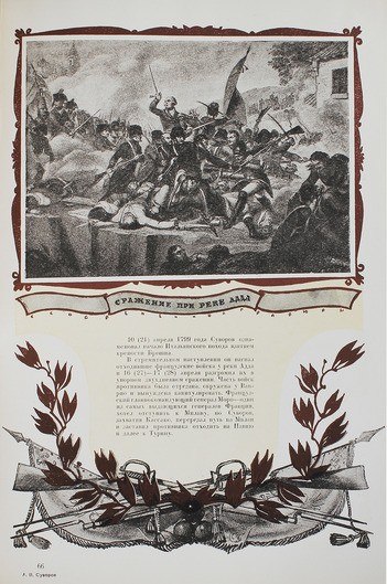 Александр Васильевич Суворов (1730 — 1800) — русский полководец, один из основоположников русского военного искусства, а также: князь Италийский, граф Российской империи Суворов-Рымникский; князь, королевский родственник («кузен короля») и гранд Сардинского королевства, граф Римской империи; генералиссимус российских сухопутных и морских сил, генерал-фельдмаршал австрийских и сардинских войск, кавалер всех российских орденов своего времени, вручавшихся мужчинам, а также многих иностранных военных орденов. Великий русский полководец, национальный герой России и военный теоретик. Полководческий гений Суворова отражен в чеканной формулировке: «не проиграл ни одного сражения, причем все они были выиграны при численном превосходстве неприятеля» (более 90 сражений).