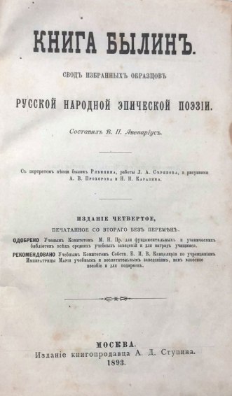 Авенариус Василий Петрович (1839 -1923) ‒ русский писатель, беллетрист. Былины, изданные в книге, были записаны с голоса в глухих деревнях Олонецкой, Архангельской и Пермской губерний у последних сказителей, как правило, зажиточных крестьян, в которых, по замечанию собирателя былин Гильфердинга, соединились природный ум и память с порядочностью, необходимою и для практического успеха в жизни. Самым выдающимся из этих певцов был Трофим Григорьевич Рябинин, чей портрет приложен к книге. В качестве иллюстраций использованы картины знаменитых русских художников, посвященные былинным сюжетам.