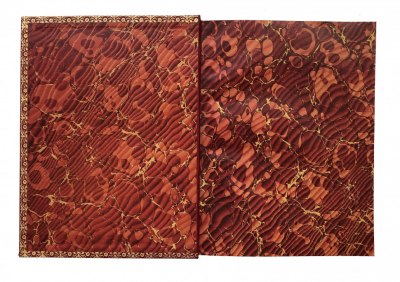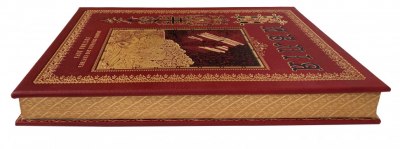В цельнокожаном переплете ручной работы с золотым тиснением.
