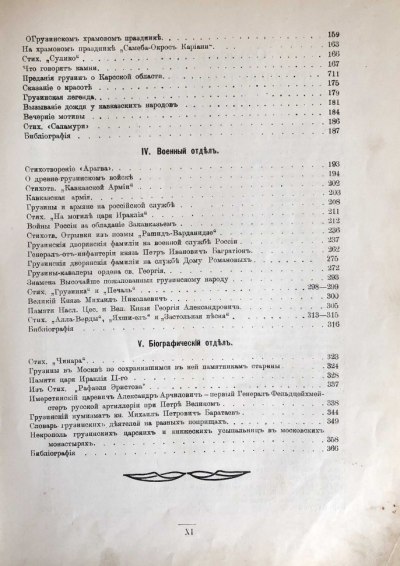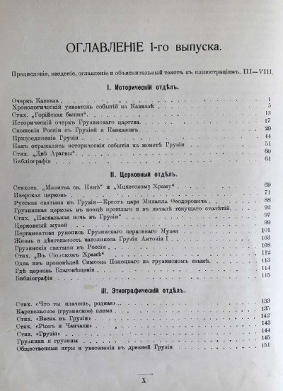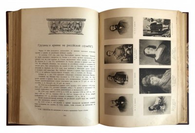 Издание включает в себя исторический отдел (очерк Грузинского царства, хронологический указатель событий на Кавказе и пр.), Церковный отдел, Этнографический отдел (включая народные праздники, игры, легенды, суеверия), Военный отдел (кавказская армия, армяне и грузины на российской службе, дворянские фамилии и пр.) и биографии. В каждом отделе присутствуют схожие по теме стихотворения и отрывки из поэм, посвященных Грузии и грузинскому народу, каждому отделу соответствует свой библиографический указатель. Тринадцать фототипий на отдельных листах и множество иллюстраций в тексте. Полный комплект. Борис Спиридонович Эсадзе (1864–1914) – историк, кавказовед, член русского военно-исторического общества, редактор и издатель первой военной газеты на Кавказе «Кавказская армия».