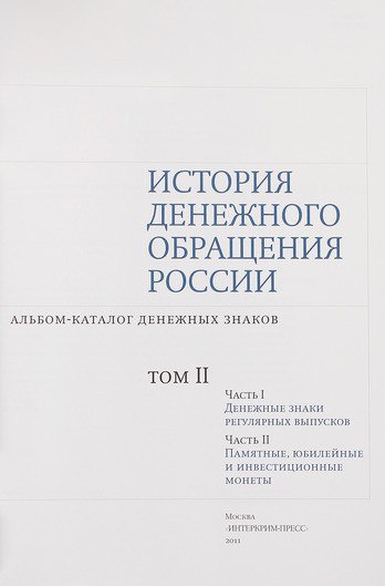 «История денежного обращения в России»- фундаментальное иллюстрированное двухтомное издание, подготовленное ведущими учеными Российской академии наук, Государственного Исторического музея, Государственного Эрмитажа и посвященное этапам становления и развития денежного обращения России от первых русских денежно-весовых систем домонгольского периода до создания денежной системы Российской Федерации. Прекрасно иллюстрированное издание включает в себя материалы государственных фондов и частных коллекций. Особое внимание уделено важнейшей вехе преобразования финансово-экономической системы страны - периоду становления и развития Российской империи от начала проведения Петром I денежной реформы в первой четверти XVIII в. до формирования кредитно-финансовых структур во второй половине XIX в., создания первого Государственного банка России