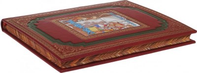 В цельнокожаном переплете ручной работы с иллюстрацией на передней крышке.