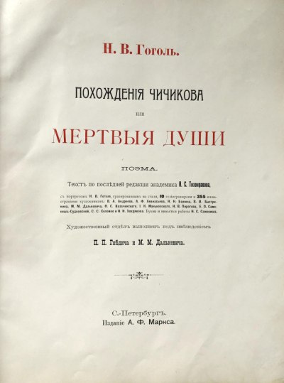 Текст поэмы Н. В. Гоголя в последней редакции академика Н. С. Тихонравова, с портретом Н. В. Гоголя, гравированным на стали, 10 гелиогравюрами и 355 иллюстрациями художников: В. А. Андреева, А. Ф. Афанасьева, Н. Н. Бажина, В. И.Быстренина, М. М. Далькевича, Ф. С. Козачинскаго, И. К. Маньковскаго, Н. В. Пирогова, Е. П. Самокиш-Судковской, С. С. Соломко и Н. Н. Хохрякова. Буквы и виньетки работы Н. С. Самокиша.