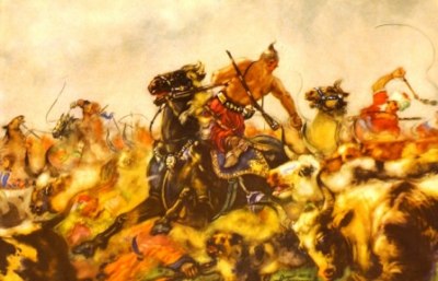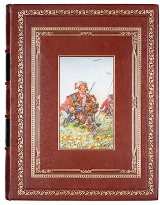 «Тарас Бульба» — самое яркое произведение Н.В. Гоголя (1809 –1852), освещающее героическую эпоху казачьей вольницы, «с ее удалью, разгульною жизнью, беспечностью и ленью, его буйными оргиями и кровавыми набегами». Обретение прошлого достигается у Гоголя не скрупулезным показом исторической хроники, не археологической тщательностью деталей, а обобщением событий, романтической наполненностью образов, когда драматические судьбы героев приобретают эпический размах. Текст сопровождается иллюстрациями Александра Михайловича Герасимова (1881–1963), живописца, теоретика искусства, педагога, первого президента Академии художеств СССР. Черно-белые иллюстрации передают динамику сюжета, а цветные иллюстрации на отдельных листах передают неповторимый колорит украинской природы, быта вольных казачьих поселений, Запорожской Сечи.В коричневом цельнокожаном переплете ручной работы с тиснением золотом и иллюстрацией на передней крышке. Коричневый тонированный обрез. Коричневое тонкое шелковое ляссе.