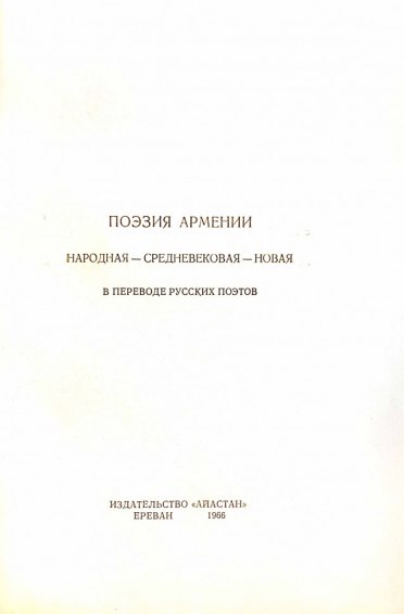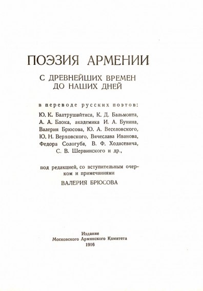 Первое издание редкого литературного памятника. Показать богатства, неповторимое своеобразие армянской литературы, ее мировое культурное значение — вот та задача, которую поставили перед собой выдающиеся русские поэты и переводчики. Армения еще в древности достигла высокой степени развития культуры, ее литература восходит к V в. н.э. Так, В. Брюсов писал, что «немногие народы могут гордиться, что их народные песни достигают такого же художественного уровня, так изысканно-пленительны, так оригинально самобытны, при всей их непосредственной простоте и безыскусственной откровенности». В сборнике представлена любовная лирика, песни (свадебные и военные), народный эпос, религиозная поэзия армянской Церкви, поэзия ашугов, новая поэзия русских и турецких армян.