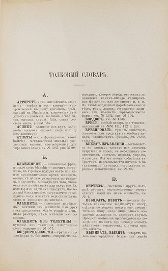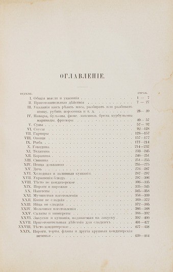 Настоящее издание содержит множество различных рецептов, от самых распространенных до весьма экзотических. Рассмотрены различные вопросы от чистоты и организации кухни, например, материала посуды, на которой пища меньше всего пригорает и приобретает лучший вкус, до способов приготовления различных блюд из овощей, рыбы, говядины, телятины, баранины, свинины, домашней птицы и дичи, блюда из муки, круп, молока и т.д. Автор приводит рецепты супов, соусов, гарниров, холодных и заливных блюд, салатов, кондитерских изделий и десертов, паштетов и др. Большое внимание уделено оформлению стола, кулинарной эстетике.