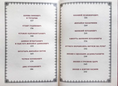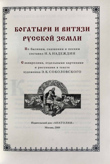 Переиздание собрания былин, сказаний и песен, составленного Н.И.Надеждиным и вышедшего в издательстве М.О.Вольфа в 1911 году. Книга оформлена многочисленными акварелями, отдельными картинами и рисунками художника Э.К.Соколовского.
