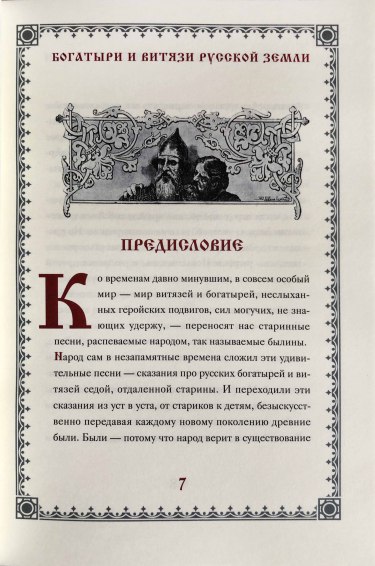 Богато иллюстрированный прозаический пересказ старинных русских былин, сказаний и песен о давно минувших временах, о подвигах во славу Святой Руси, о жизни и деяниях богатырей и витязей.
