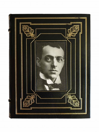 Книга в цельнокожаном переплете ручной работы с тиснением золотом и иллюстрацией на передней переплетной крышке.