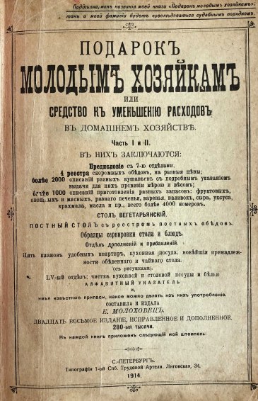 Самая известная кулинарная книга России всех времен. Издание включает в себя тысячу рецептов, меню и практические советы по ведению домашнего хозяйства.