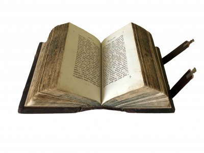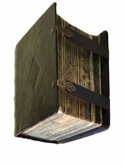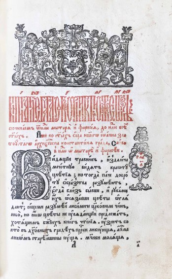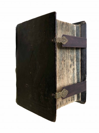Книга в цельнокожаном переплете с тиснением. Имеются две застежки. Большой формат. Имеются заставки, концовки и орнаментальные украшения.