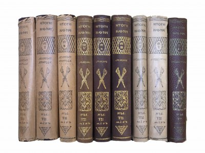 Твердые издательские полукожаные переплеты с золотым тиснением по корешку. Под переплетами — художественные издательские обложки. Меццотинто-гравюры, таблицы под кальками. Сохранены суперобложки к 5 томам. Энциклопедический формат.