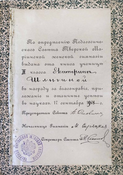 Книга в издательском коленкоровом переплете. В издание вложена грамота о том, что эта книга была подарена ученице гимназии за заслуги в 1901 году.