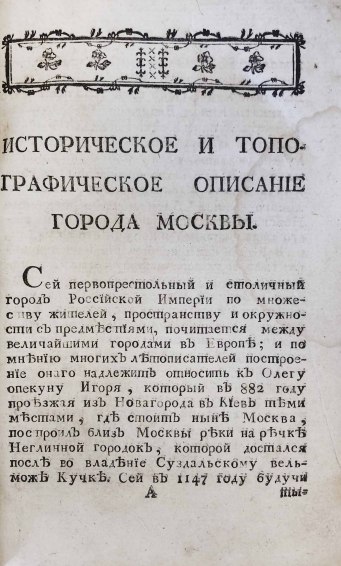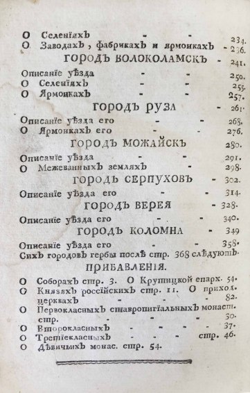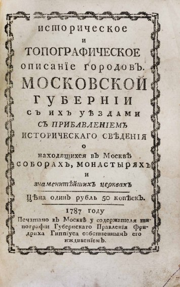 Полное название: Историческое и топографическое описание городов Московской губернии с их уездами прибавлением историческаго сведения о находящихся в Москве соборах, монастырях и знаменитейших церквах.