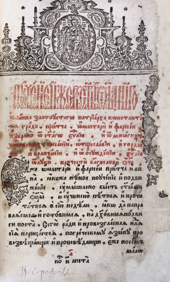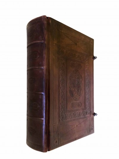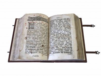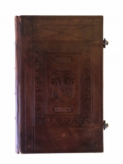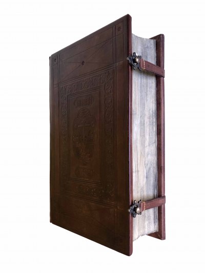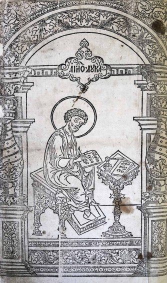 Книга в цельнокожаном переплете с тиснением. Имеются две застежки. Заставки, концовки и орнаментальные украшения. Печать в два цвета. Гравюра с изображением апостола Луки. Некоторые страницы отреставрированы.