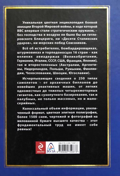 Уникальная энциклопедия боевой авиации Второй Мировой войны, в ходе которой ВВС впервые стали стратегическим оружием. Всё об истребителях, бомбардировщиках, штурмовиках и торпедоносцах 16 стран — как великих авиадержав (Великобритании, Германии, Италии, СССР, США, Франции, Японии), так и второстепенных (Австралии, Аргентины, Нидерландов, Польши, Румынии, Финляндии, Чехословакии, Швеции, Югославии), Исчерпывающие сведения о 250 типах самолетов — от архаичных бипланов до новейших реактивных машин, от легких одноместных до тяжелых 4-моторных гигантов, как сухопутного базирования, так и палубных, не только массовых, но и малосерийных. Колоссальный объем информации, увеличенный формат, цветная элитная полиграфия, более 1500 схем, чертежей и фотографий на мелованной бумаге высшего качества — этот фундаментальный труд не имеет себе равных!