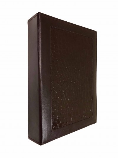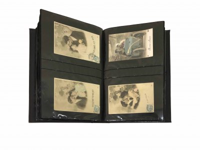 В переплете под кожу крокодила. Некоторые открытки подписаны.
