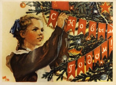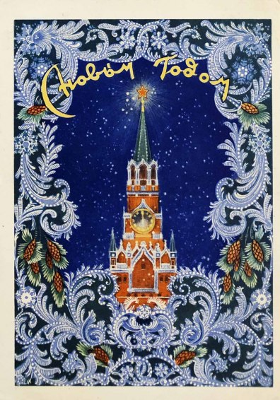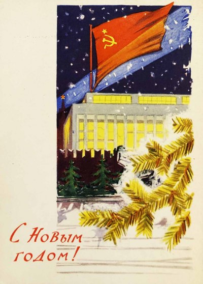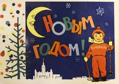 Примеры открыток: открытки с яркими праздничными иллюстрациями в разных стилях изданные в СССР в 1950-х и 1960-х годах.