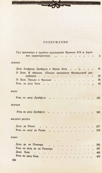 В книгу вошли десять речей виднейших судебных ораторов Франции XIX века: Лашо, Шэд‘Эст Анжа, Мано, Морнара, Дюпена, Лабори. Приводится письмо президенту Французской республики писателя Эмиля Золя «Я обвиняю». Наряду с речами по такому чрезвычайному по своему политическому значению делу, как дело Альфре-да Дрейфуса, в сборнике представлены речи, произнесенные по уголовным делам, возникавшим на чисто бытовой основе (знаменитые процессы Поммерэ, Ронсьера и др.).