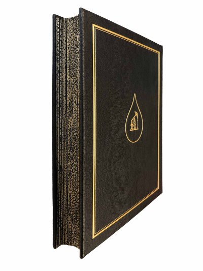 В цельнокожаном переплете ручной работы с тиснением золотом и иллюстрацией на передней крышке. Обрез коричневого крапления. Тонкое шелковое ляссе. Иллюстрированные форзацы.