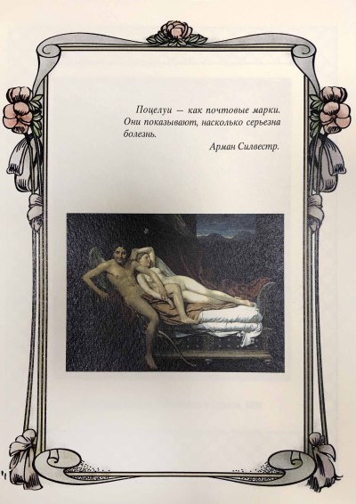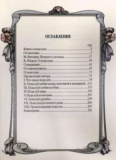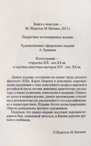 Данное издание составлено на основе труда датского филолога XIXв. Карла Нюропа и дополнено современными сведениями о теме поцелуйного жанра в мировой и российской прозе, поэзии, живописи, архитектуре, скульптуре, а также кулинарии, психологии и медицине. Написано легко и непринужденно, данное произведение относит нас к истокам поцелуя, рассказывает о его классификациях и характеристиках. Издание богато иллюстрированно.