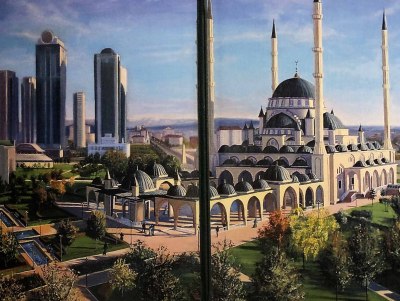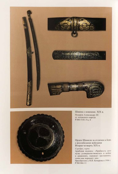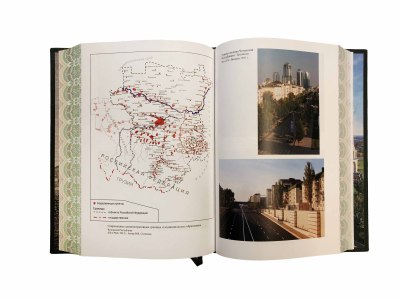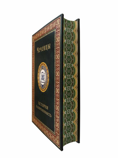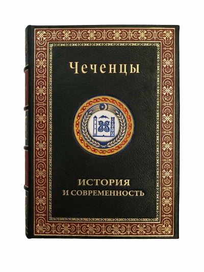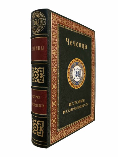 Книга в цельнокожаном переплете ручной работы с тиснением золотом на передней крышке и корешке, дизайнерское оформление форзацев. Узорный обрез. Инкрустация герба Чечни.