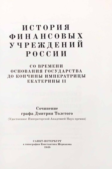 Книга известного русского историка и государственного деятеля Д. А.Толстого (1823-1889), в которой представлена история финансовых учреждений в России с древних времен до конца XVIII века. Автор последовательно прослеживает развитие различных источников государственных доходов России — податей, сборов, пошлин, налогов. Исследует возникновение банков в нашей стране. В конце книги содержится сравнительный анализ развития финансовых учреждений древней России и средневековых западноевропейских государств.
